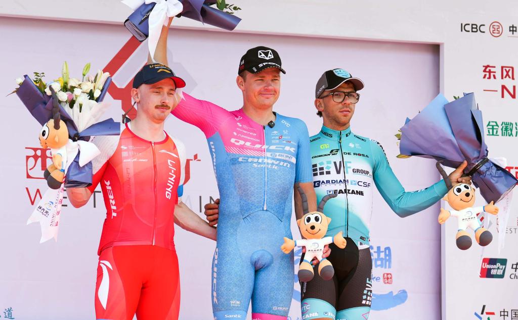 7月9日,賽段冠軍愛沙尼亞快客車隊車手拉亞斯·馬丁(中)、亞軍李寧之星車隊車手謝爾比·亞歷山大(左)、季軍意大利巴迪亞尼車隊車手扎農塞洛·恩洛科在領獎臺上合影。新華社記者 齊芷玥 攝
