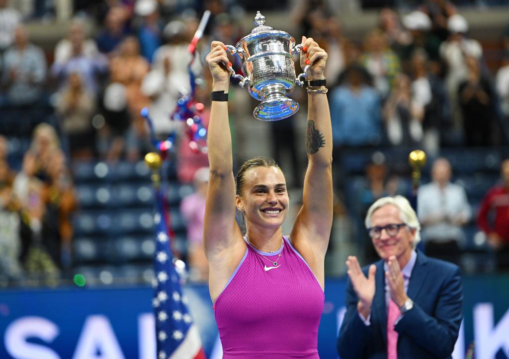 2024年9月7日,薩巴倫卡在頒獎(jiǎng)儀式上高舉獎(jiǎng)杯。當(dāng)日,在2024美國(guó)網(wǎng)球公開賽女子單打決賽中,白俄羅斯選手薩巴倫卡2比0戰(zhàn)勝美國(guó)選手佩古拉,獲得冠軍。新華社記者 李睿 攝