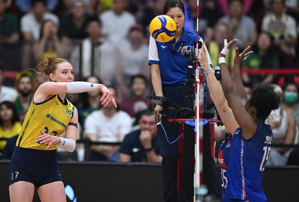 巴西隊在小組賽中曾以3:2險勝法國隊,這次她們以27:25、33:31和25:19勝出。前兩局的爭奪異常激烈,第二局更是一波三折。法國隊一度取得19:15的優(yōu)勢,卻被巴西隊連得4分追成19平。此后,巴西隊以24:22率先拿到局點,卻被法國隊連得3分以25:24反超。領先幾度易手、雙方又多次錯過局點之后,比分來到31平。關鍵時刻,庫迪耶斯扣球成功,接下來加比在反擊中推攻得分,幫助巴西隊以33:31險勝。
