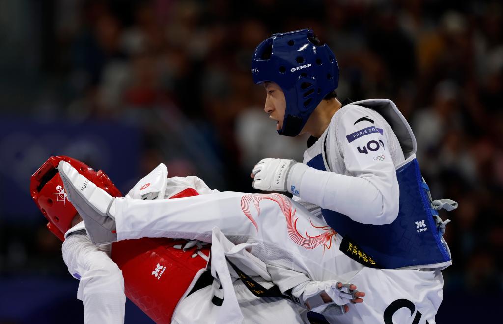 2024年8月8日,中國選手梁育帥(右)在巴黎奧運(yùn)會(huì)跆拳道男子68公斤級(jí)16強(qiáng)賽上。新華社記者 費(fèi)茂華 攝