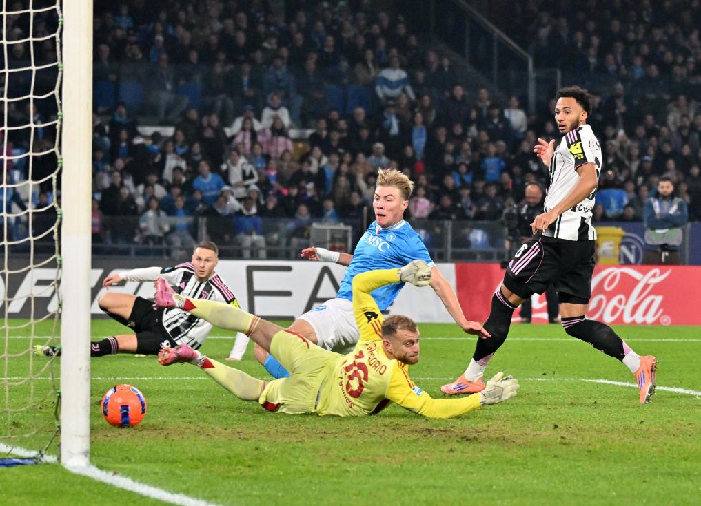 那不勒斯開場不久就有所斬獲。第七分鐘,霍伊倫接隊友內(nèi)雷斯的橫傳,近距離包抄破門。此后兩隊你來我往,上半時接近尾聲時,尤文球員凱利將絕佳機會球踢飛,而主隊麥克托米納的頭球也被立柱拒絕。