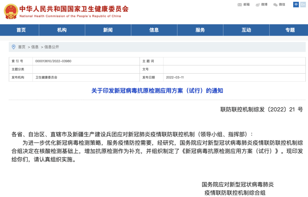通知指出,為進(jìn)一步優(yōu)化新冠病毒檢測(cè)策略,服務(wù)疫情防控需要,經(jīng)研究,國(guó)務(wù)院應(yīng)對(duì)新型冠狀病毒肺炎疫情聯(lián)防聯(lián)控機(jī)制綜合組決定在核酸檢測(cè)基礎(chǔ)上,增加抗原檢測(cè)作為補(bǔ)充。
