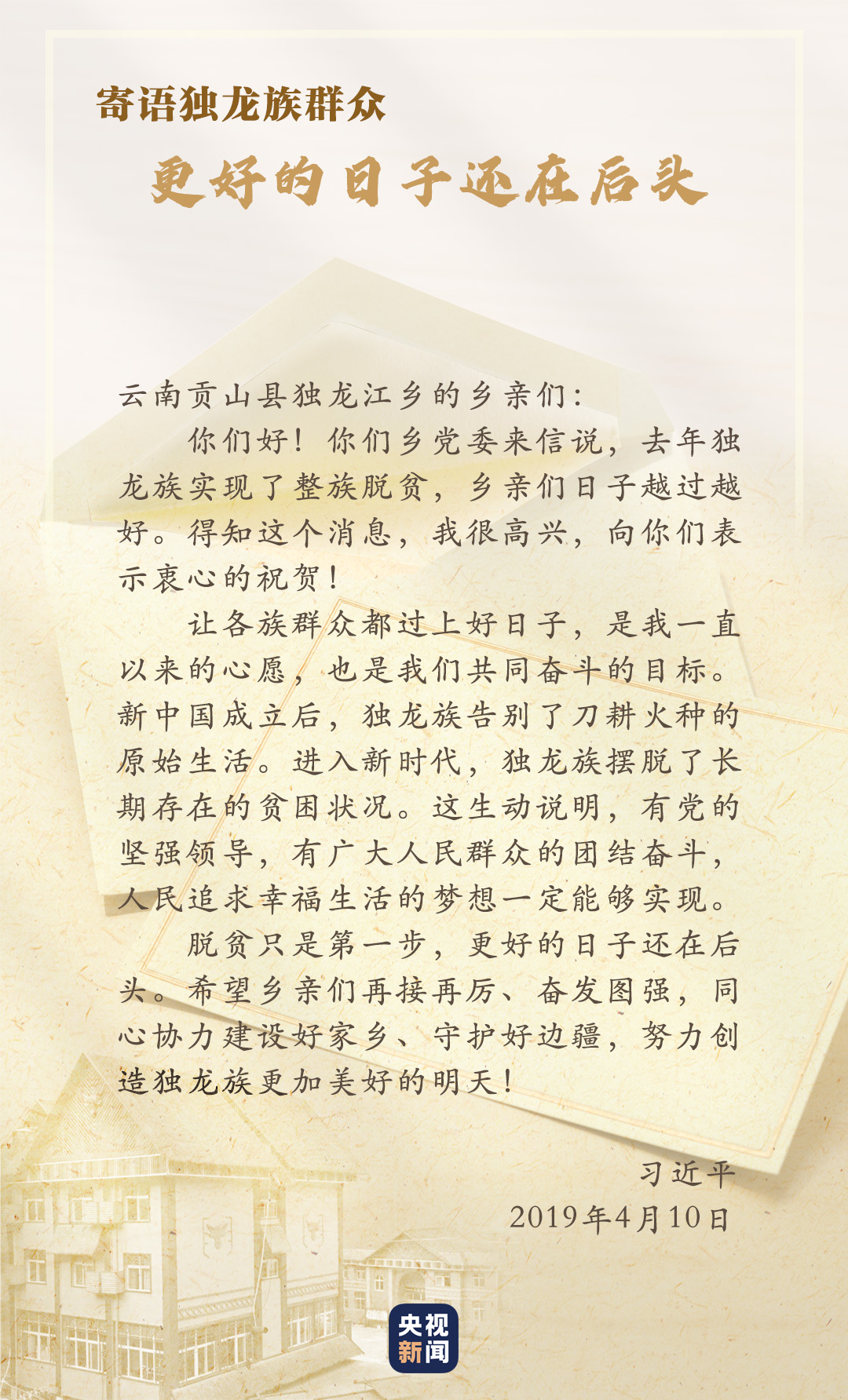 2018年,獨(dú)龍江鄉(xiāng)6個(gè)行政村整體脫貧,獨(dú)龍族實(shí)現(xiàn)整族脫貧,基礎(chǔ)設(shè)施、特色產(chǎn)業(yè)、社會(huì)事業(yè)等都發(fā)生了巨大變化。貢山縣干部群眾再次給習(xí)近平寫(xiě)信匯報(bào)脫貧成績(jī),習(xí)近平得知后非常高興,向他們表示“衷心的祝賀”,并勉勵(lì)鄉(xiāng)親們?yōu)檫^(guò)上更加幸福美好的生活繼續(xù)團(tuán)結(jié)奮斗。