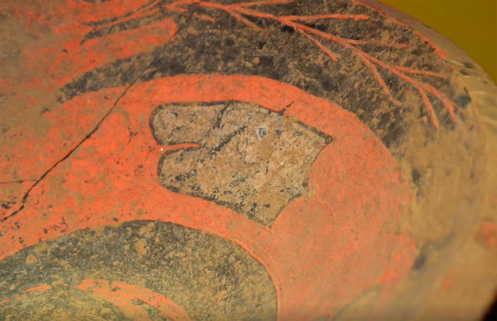 彩繪龍盤于1980年出土于陶寺遺址,灰褐色陶胎,敞口、折腹、平底,通體磨光。盤底用紅彩涂色,紅灰相間的蟠龍圍繞紅色圓盤面盤旋,蟠龍身盤如蛇,體上有似鱷魚一樣的鱗狀斑紋,口銜枝狀物,專家辨識后認(rèn)為是禾苗。