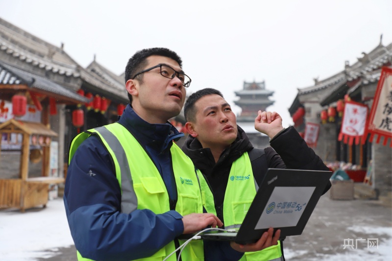 離開商鋪,郭勇和同事又來到古縣城十字街的中心點,這里是古縣城人流最為密集的地方,也是游客用網(wǎng)需求最大的地方?!霸谥行奈恢?,我們放置了2個5G基站,同時在城墻外放置了6個,內(nèi)城墻上放置了7個,還在一些網(wǎng)絡(luò)覆蓋較弱的小街道放置了‘微站’設(shè)備進行擴容。春節(jié)期間,我們還會組織應(yīng)急保障隊進行通信保障,通過這樣的基站布局最大限度保障游客的通信順暢?!闭f話間,郭勇和同事一人操作電腦,一人操作手機已經(jīng)完成了此處的信號測試。