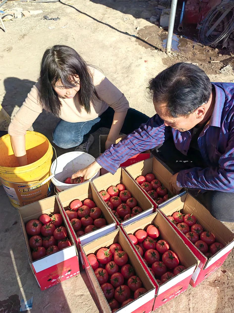 ▲剛采摘的西紅柿裝箱售賣(mài)