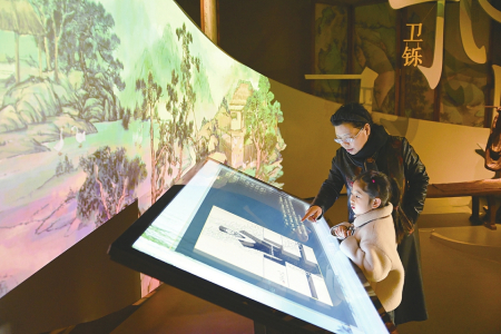 2月8日,運(yùn)城市河?xùn)|歷史文化展示中心內(nèi),游客正在數(shù)字互動(dòng)屏幕前駐足查看歷史資料。楊晨玉攝