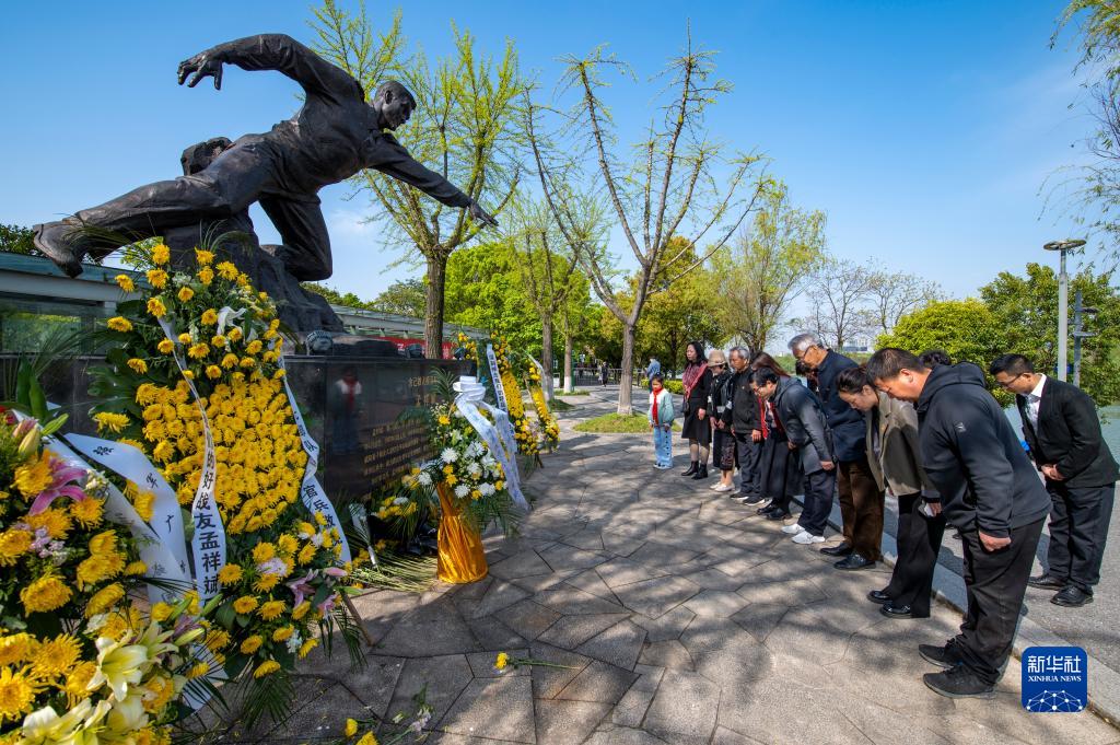 4月4日,浙江省金華市城南橋橋頭孟祥斌烈士塑像前,市民向英雄鞠躬致敬。