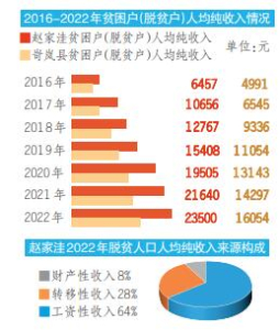 趙家洼重生了。盛夏6月,東西兩面山坡放眼望去,昔日荒坡披上了層層綠裝,郁郁蔥蔥,生機(jī)勃勃。搬到縣城的趙家洼人,收入一路高漲,從2016年的6457元增加到去年的23500元。