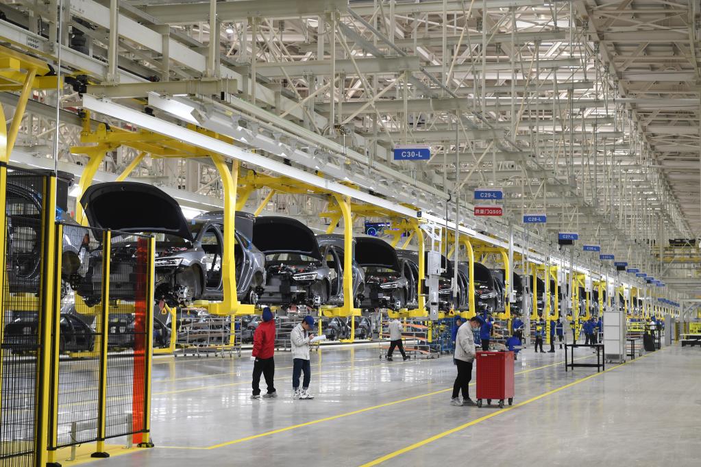 在合肥經(jīng)濟(jì)技術(shù)開(kāi)發(fā)區(qū)的一家新能源汽車(chē)生產(chǎn)企業(yè),工人在整車(chē)生產(chǎn)線上作業(yè)。新華社發(fā)(解琛攝)