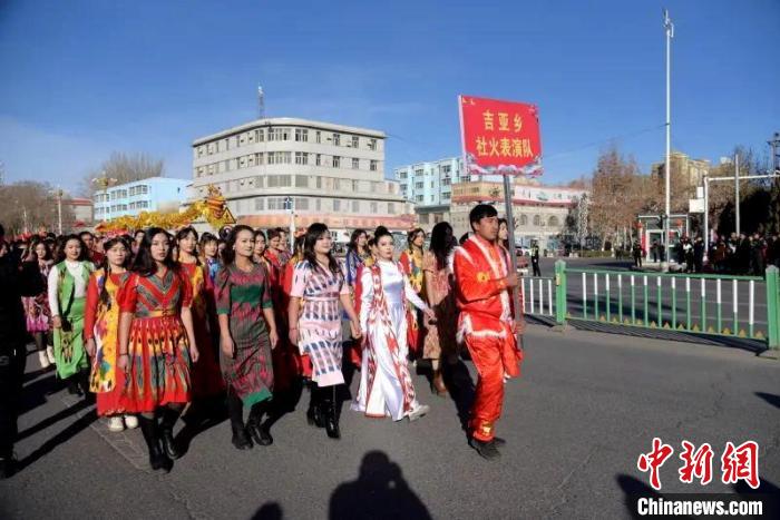 2月12日,農(nóng)歷正月初三,和田市舉行2024年“龍騰盛世·春滿萬家”社火活動,和田市伊里其鄉(xiāng)社火表演隊巡街。 張亞輝 攝