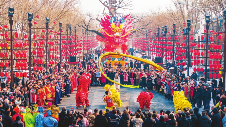 今年春節(jié),“夢回長平”不夜城街區(qū)以“炎黃子孫、龍行天下”為理念打造了浩大的龍燈燈會(huì),598米長的金紅色巨型龍燈順著街區(qū)主干道起伏而上,龍頭栩栩如生、威風(fēng)凜凜,龍身通體華麗,穿梭于祥云之中。雖然這里主打的是夜經(jīng)濟(jì),為了讓游客們玩開心、玩盡興,“夢回長平”不夜城從上午十點(diǎn)半就開始推出不同主題的舞蹈、年俗展演等節(jié)目。