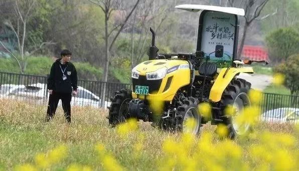 ▲位于光谷北斗大廈的武漢依迅北斗時空技術股份有限公司園區(qū)內(nèi),安裝了北斗高精度農(nóng)機自動駕駛終端的拖拉機正在進行測試