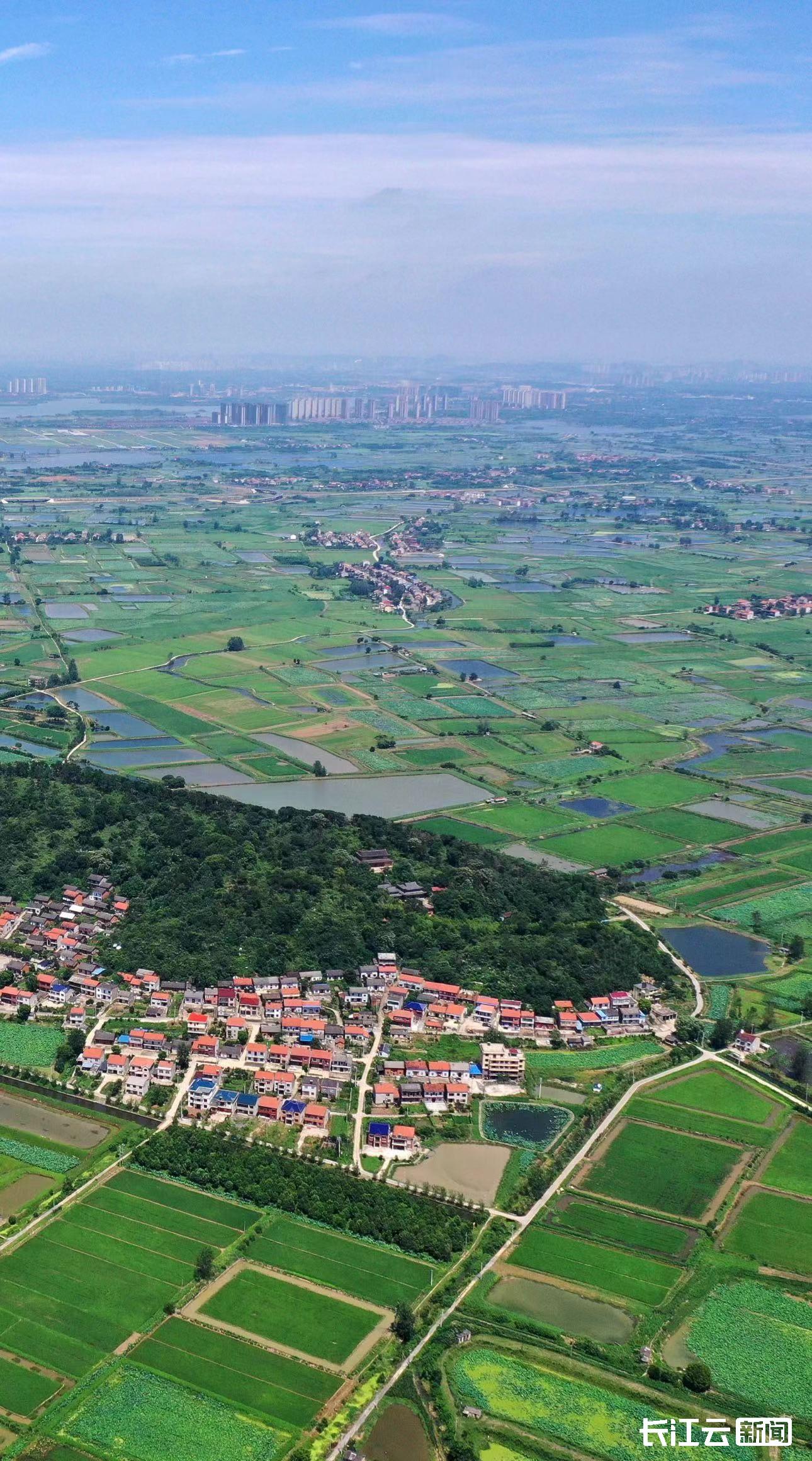 ▲鳥瞰春天的鄂州長港鎮(zhèn)峒山村,村容整潔、綠樹成蔭