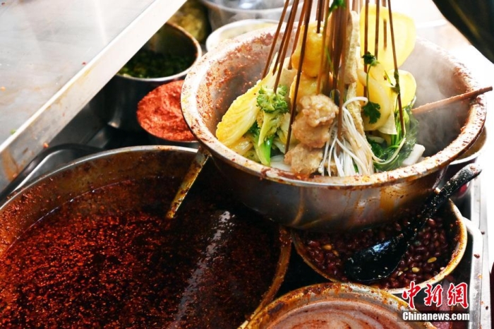 3月14日,甘肅天水,游客手舉挑選的麻辣燙食材。九美旦增 攝