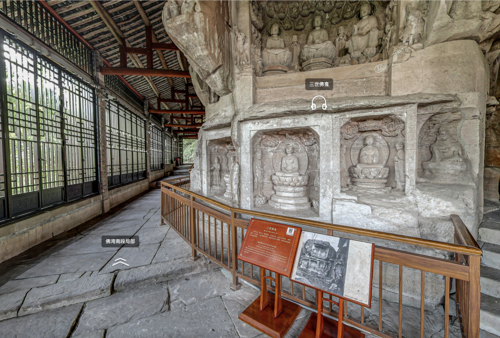 大足石刻數(shù)字博物館中的三世佛龕實(shí)景圖。(大足石刻數(shù)字博物館官網(wǎng)截圖)