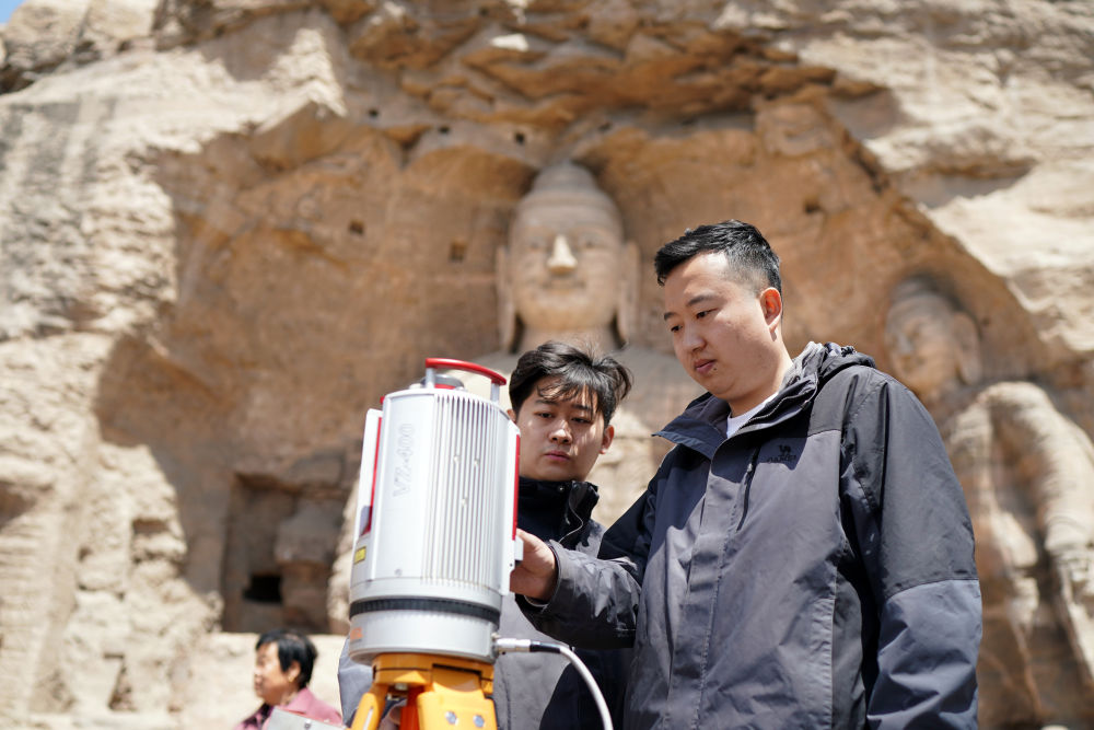 云岡研究院數(shù)字化保護中心工作人員在進行數(shù)據(jù)采集(2021年5月8日攝)。