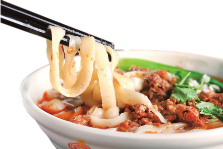 在開(kāi)始削面之前,非常重要的步驟就是和面和醒面。和面的面和水需要按照一定的比例,同時(shí)對(duì)水溫也有一定的要求,冬天要用熱水,夏天要用涼水,春秋要用溫水。和好面之后緊接著就是醒面,需要用濕布蓋住面團(tuán)醒20分鐘左右。如果說(shuō)吃刀削面是飽了口福,那么看刀削面下鍋可稱之為飽了眼福。一只手托著放著面團(tuán)的案板,另一只手拿著削面刀,削面刀又分為片刀和勾刀,削面時(shí),出力要平,用力要均,削出的面條中間厚兩邊薄,一葉連著一葉,在空中劃出一道道弧形白線,落入鍋中的面條好似一條條銀魚,隨著熱水的翻滾不斷舞動(dòng)。有順口溜贊曰:“一葉落鍋一葉飄,一葉離面又出刀,銀魚落水翻白浪,柳葉乘風(fēng)下樹(shù)梢?!?/p>