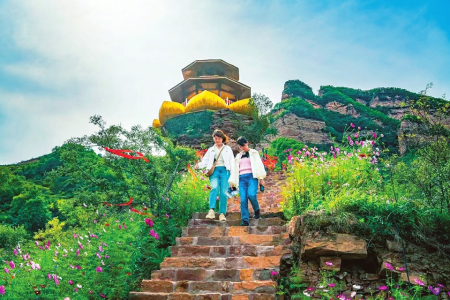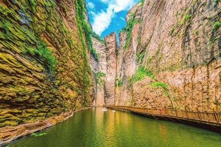 黃崖洞文化旅游區(qū)赤壁丹崖如屏如畫,林蔭如蓋、疊瀑成群,吸引游客紛至沓來。張斌全攝