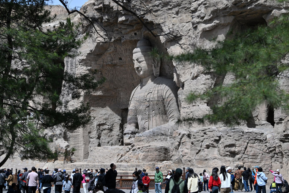 4月15日,游客在山西大同云岡石窟游覽。成立于2021年的云岡研究院