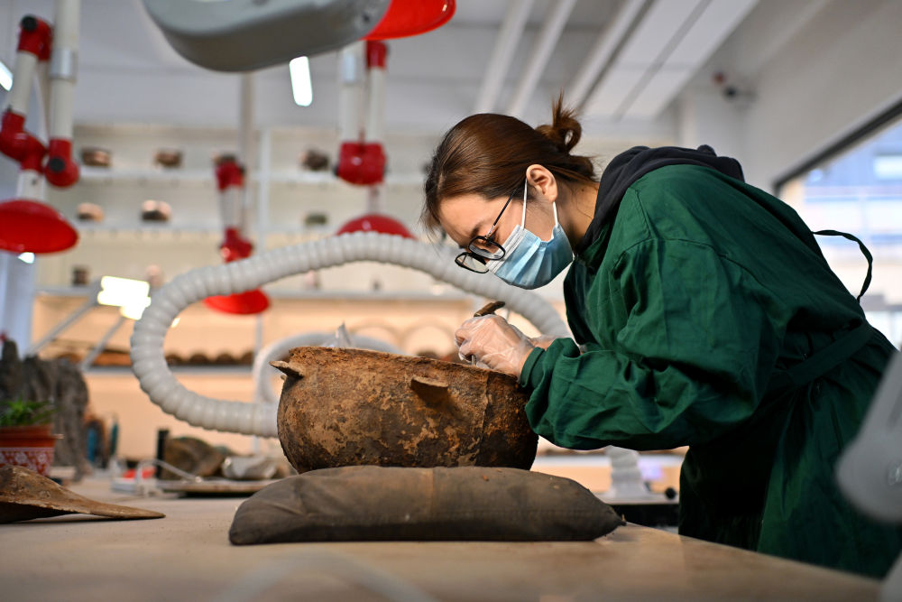 4月15日,在云岡研究院可移動(dòng)文物修復(fù)室,工作人員孫麗娜在進(jìn)行鐵器修復(fù)。
