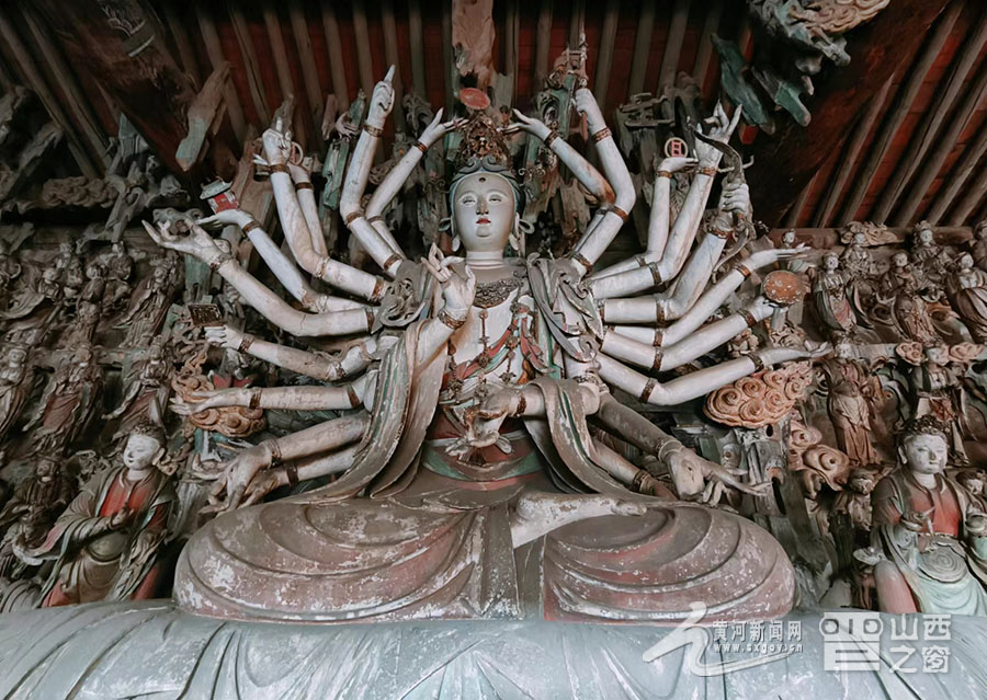 寺內(nèi)擁有總計2000多尊彩塑,大者丈余、小者尺許,每一壁龕為一獨立神話或佛教故事,人物造型生動,神態(tài)逼真,尤其以“千手觀音像”與“韋馱像”最為經(jīng)典。舞蹈《千手觀音》的靈感原型就是這尊千手觀音像。塑像高達(dá)數(shù)米,全身貼金,背后伸出上千只手臂,每只手掌上都有一只眼睛,錯落有致,整個造像氣勢恢宏,達(dá)到雕塑藝術(shù)中和諧、完美的境界。韋馱像巍然肅立,身披甲胄,神情凝重,整個身體呈現(xiàn)出一種微妙的動態(tài)平衡,是明代彩塑中少見的藝術(shù)杰作,被譽為“天下第一韋馱”“全國韋馱之冠”。景區(qū)講解員侯麗娟介紹:“這尊塑像的高明之處就在于匠師不落俗套,打破了一般程式的限制,賦予了韋馱一種時間的節(jié)奏性和動作的連續(xù)性,產(chǎn)生了雕塑作品的最高境界‘不動之動’?!?/p>