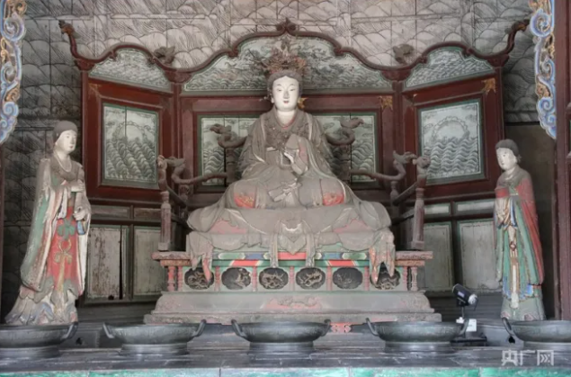 外觀玲瓏似涼亭——獻殿。獻殿是給圣母殿邑姜供奉祭品的享堂,始建于金大定八年(1168),明萬歷二十二年(1594)重修。獻殿高9.75米,其梁架節(jié)省材料且堅固,斗拱結構疏朗,外觀玲瓏似涼亭。