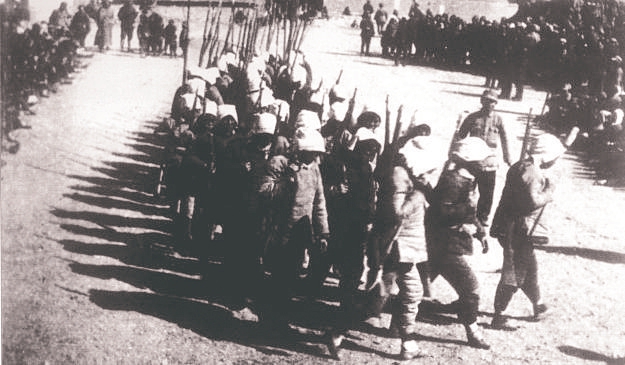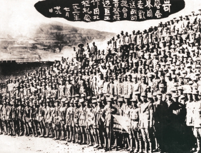 圖2 山西新軍既是戰(zhàn)斗隊,又是工作隊。他們走到哪里,宣傳到哪里,動員青年參軍;組織人民武裝自衛(wèi)隊、游擊隊;協(xié)助地方建黨、建政,組建工、農(nóng)、青、婦等群眾團體,創(chuàng)建抗日根據(jù)地。圖為1938年初,決死隊戰(zhàn)士在沁縣書寫宣傳標語。