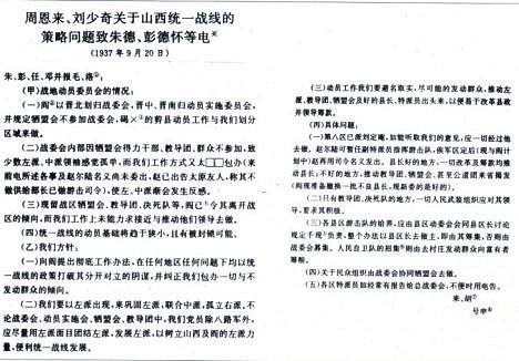 圖1 1937年9月20日,周恩來、劉少奇關(guān)于山西統(tǒng)一戰(zhàn)線的策略問題致朱德、彭德懷等電。