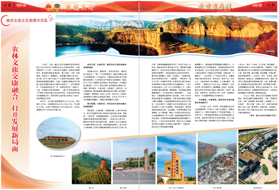 “十四五”以來(lái),偏關(guān)生態(tài)文化旅游示范區(qū)始終堅(jiān)持以習(xí)近平新時(shí)代中國(guó)特色社會(huì)主義思想為指導(dǎo),全面貫徹黨的二十大及二十屆歷次全會(huì)精神,按照省市部署要求,堅(jiān)定踐行綠色發(fā)展理念,深入實(shí)施“三綠”發(fā)展戰(zhàn)略,向新發(fā)力,逐綠前行,高質(zhì)量發(fā)展駛?cè)肟燔?chē)道。老牛灣、紅門(mén)口地下長(zhǎng)城2個(gè)4A級(jí)景區(qū)成功創(chuàng)建,乾坤灣獲批省級(jí)旅游度假區(qū);長(zhǎng)城一號(hào)旅游公路偏關(guān)老牛灣段入選全省旅游公路28個(gè)精品示范段之一;老牛灣村獲得“中國(guó)美麗休閑鄉(xiāng)村”和“農(nóng)家樂(lè)特色村”雙稱(chēng)號(hào),入選“中國(guó)慢生活休閑體驗(yàn)區(qū)”,被中央宣傳思想文化工作領(lǐng)導(dǎo)小組評(píng)為第七屆全國(guó)文明村;水泉村獲評(píng)省級(jí)鄉(xiāng)村旅游重點(diǎn)村;黃河宿集入選首批山西省總工會(huì)職工療休養(yǎng)服務(wù)點(diǎn)名單。
